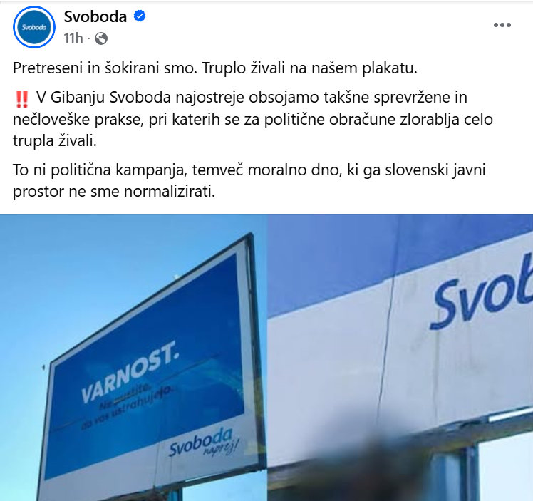 V Gibanju Svoboda so zgroženi. “Pretreseni in šokirani smo. Truplo živali na našem plakatu,” so sporočili na spletnem omrežju Facebook. Ob tem so dodali: “V Gibanju Svoboda najostreje obsojamo takšne sprevržene in nečloveške prakse, pri katerih se za politične obračune zlorablja celo trupla živali. To ni politična kampanja, temveč moralno dno, ki ga slovenski javni prostor ne sme normalizirati.”