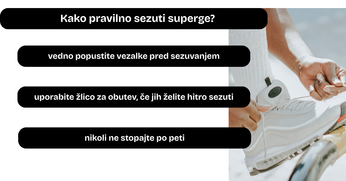 Da bi se izognili tem težavam, je najbolje, da superge pred vsakim sezuvanjem popolnoma razvezate. Če vam je to pretežko, pa lahko vsaj storite naslednje:
