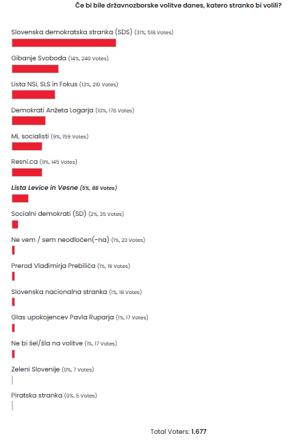 Anketa z vprašanjem »Katero stranko bi volili, če bi bile volitve danes?« je zbrala skupaj 1.677 glasov in kaže precej jasno sliko trenutnega razmerja moči. SDS vodi in dosega 31 % podpore (518 glasov). Sledi ji Gibanje Svoboda s 14 % (240 glasov). Zelo blizu je lista NSi, SLS in Fokus s 13 % (210 glasov). Demokrati Anžeta Logarja dosegajo 10 % (176 glasov). Mi, socialisti imajo 9 % (159 glasov).