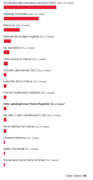 Največ podpore med sodelujočimi je prejela Slovenska demokratska stranka (SDS), za katero je glasovalo 36 odstotkov vprašanih. Na drugem mestu sledi Gibanje Svoboda s 24 odstotki, kar kaže na občuten, a še vedno precejšen zaostanek za vodilno stranko. Na tretjem mestu je z 11 odstotki glasov Resni.ca, ki med manjšimi političnimi akterji trenutno uživa največ podpore. Demokrati Anžeta Logarja so prejeli 5 odstotkov glasov, Mi, socialisti pa 4 odstotke. Po 3 odstotke oziroma manj so zbrale še Lista Levice in Vesne, Socialni demokrati (SD), Lista NSi, SLS in Fokus, Prerod Vladimirja Prebiliča, Glas upokojencev Pavla Ruparja, delež neopredeljenih volivcev ter tistih, ki se volitev ne bi udeležili.