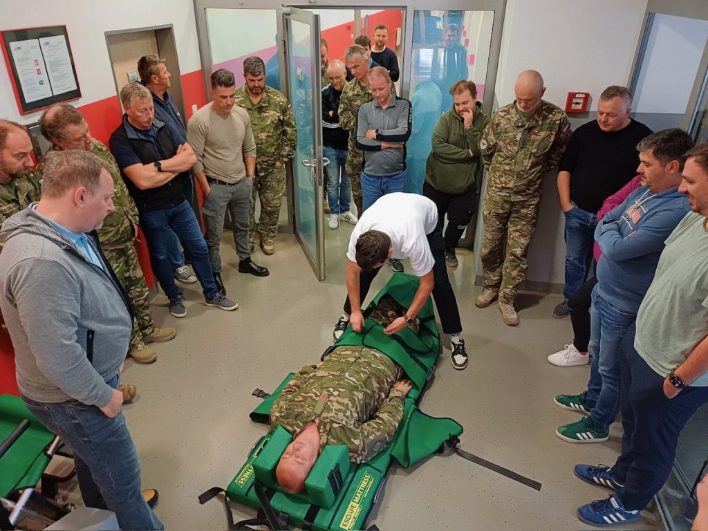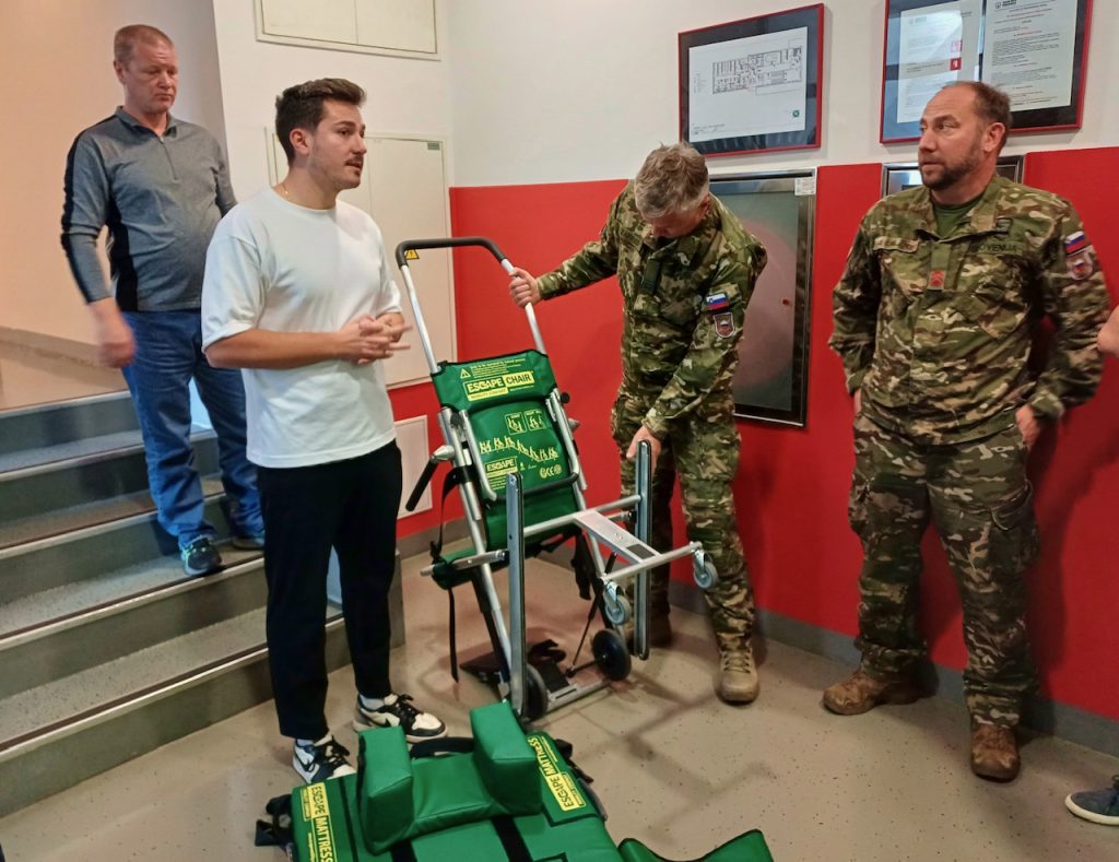 Vodja usposabljanja za vodenje evakuacije iz Slovenskega združenja za požarno varnost (SZPV) Luka Bratec pojasnjuje: “Današnje usposabljanje ni bilo namenjeno le splošnemu izvajanju evakuacij, kot jih poznamo pri vseh organizacijah oz. delodajalcih, ampak smo vanj vključili tudi predstavnike slovenske vojske in policije. Skupaj smo obravnavali konkretne primere in težave, katerimi se srečujejo znotraj vojaških struktur, seveda v civilnem delu, kako izvajati evakuacijo v primeru izrednih razmer. Med vajami smo naleteli tudi na nekatere nove situacije, ki smo jih nato skupaj analizirali in poiskali rešitve v praksi. Pomembno je, da se zavedamo, da tudi v vojski in policiji delujejo osebe z gibalnimi oviranostmi, s trajnimi ali začasnimi poškodbami. Zato smo se pri usposabljanju osredotočili na praktičen prikaz uporabe pripomočkov in postopkov za varno evakuacijo v izrednih razmerah.”